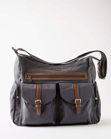The Little Unicorn Rambler Satchel is the perfect diaper bag for busy moms on the go. It is made of cotton canvas and has vegan leather accents. It has the same features as the Rotunda and Brookside Tote plus an additional four pockets! There's a place for everything! It is available in grey, obsidian, and denim.