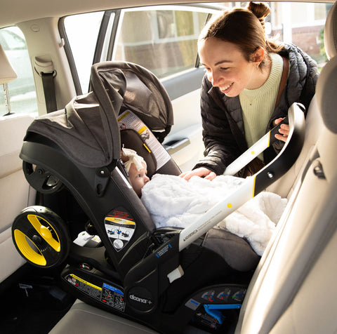 The Doona has an easy installation. You can install the included base using your vehicle's LATCH system OR with the seatbelt. You can also forego the base if you're on the go in a taxi or ride share, for example, and simply install the Doona using the seatbelt and European belt path on the back of the seat. Plus the handlebar rotates down and acts as an anti-rebound bar, providing additional stability in the event of a crash.